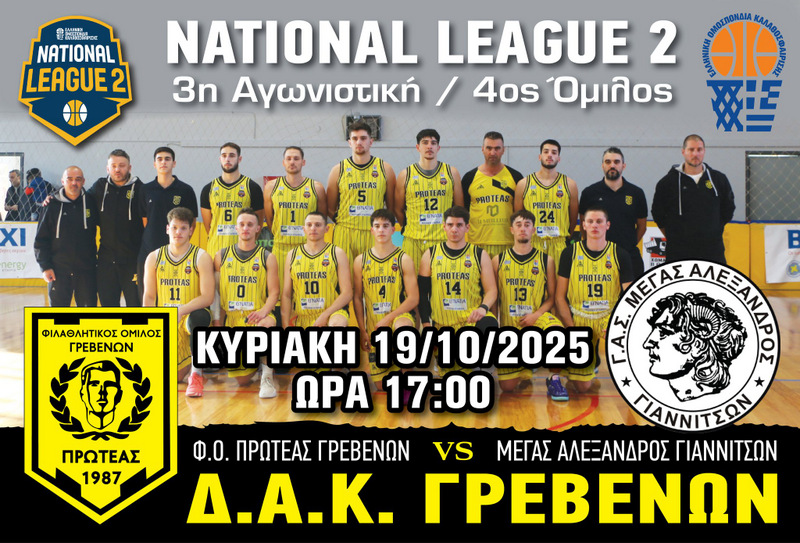 την Κυριακή 19 Οκτωβρίου και ώρα 17:00 στο ΔΑΚ Γρεβενών, για την 3η αγωνιστική της National League 2 (4ος όμιλος).