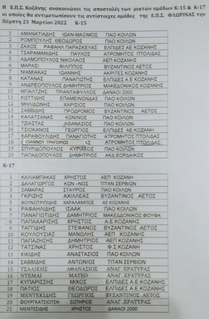 Ε.Π.Σ. Κοζάνης: Οι αποστολές των μικτών για τους αγώνες με την ΕΠΣ Φλώρινας