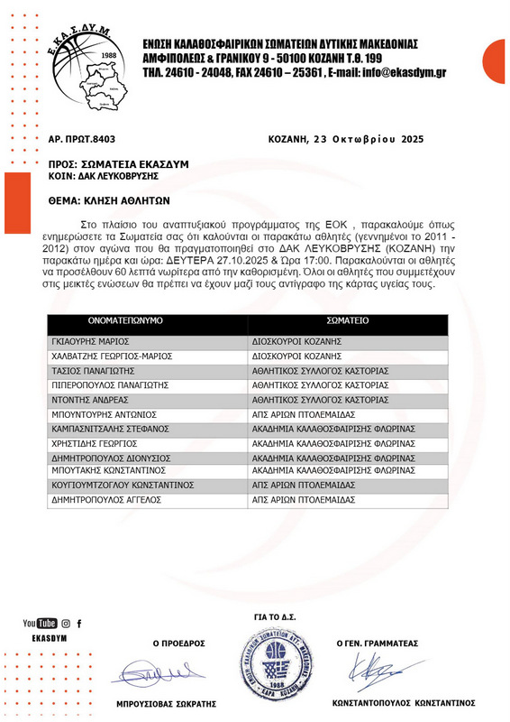 Μπάσκετ Ε.ΚΑ.ΣΔΥ.Μ.: Κλήση αθλητών για αγώνα μικτής.