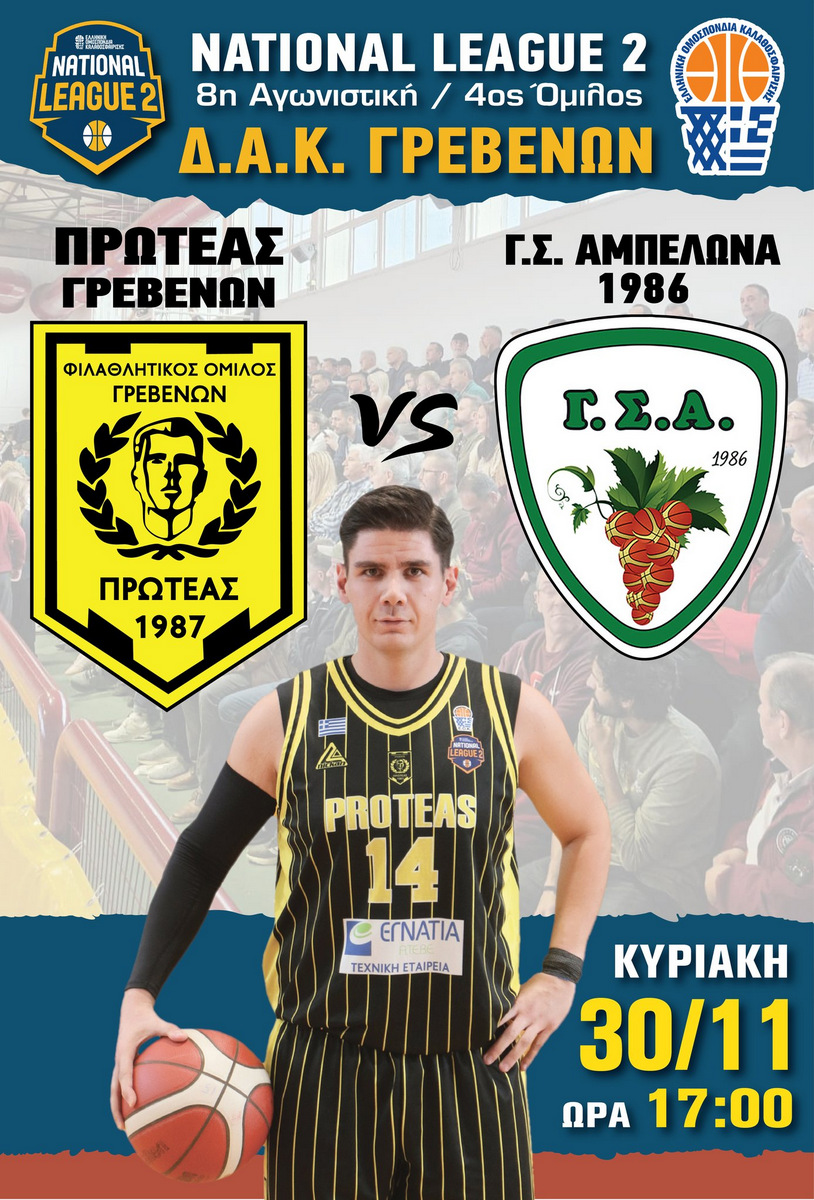 Τον Γ.Σ. Αμπελώνα θα αντιμετωπίσει ο Φ.Ο. Πρωτέας Γρεβενών την Κυριακή 30 Νοεμβρίου και ώρα 17:00 στο ΔΑΚ Γρεβενών, για την 8η αγωνιστική της National League 2(4ος όμιλος).
