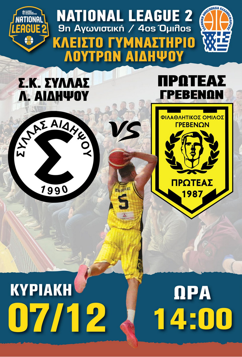 Τον Σύλλα Λ. Αιδηψού θα αντιμετωπίσει ο Φ.Ο. Πρωτέας Γρεβενών την Κυριακή 7 Δεκεμβρίου και ώρα 14:00 στο Κλειστό Γυμναστήριο Λουτρών Αιδηψού, για την 9η αγωνιστική της National League 2 (4ος όμιλος).