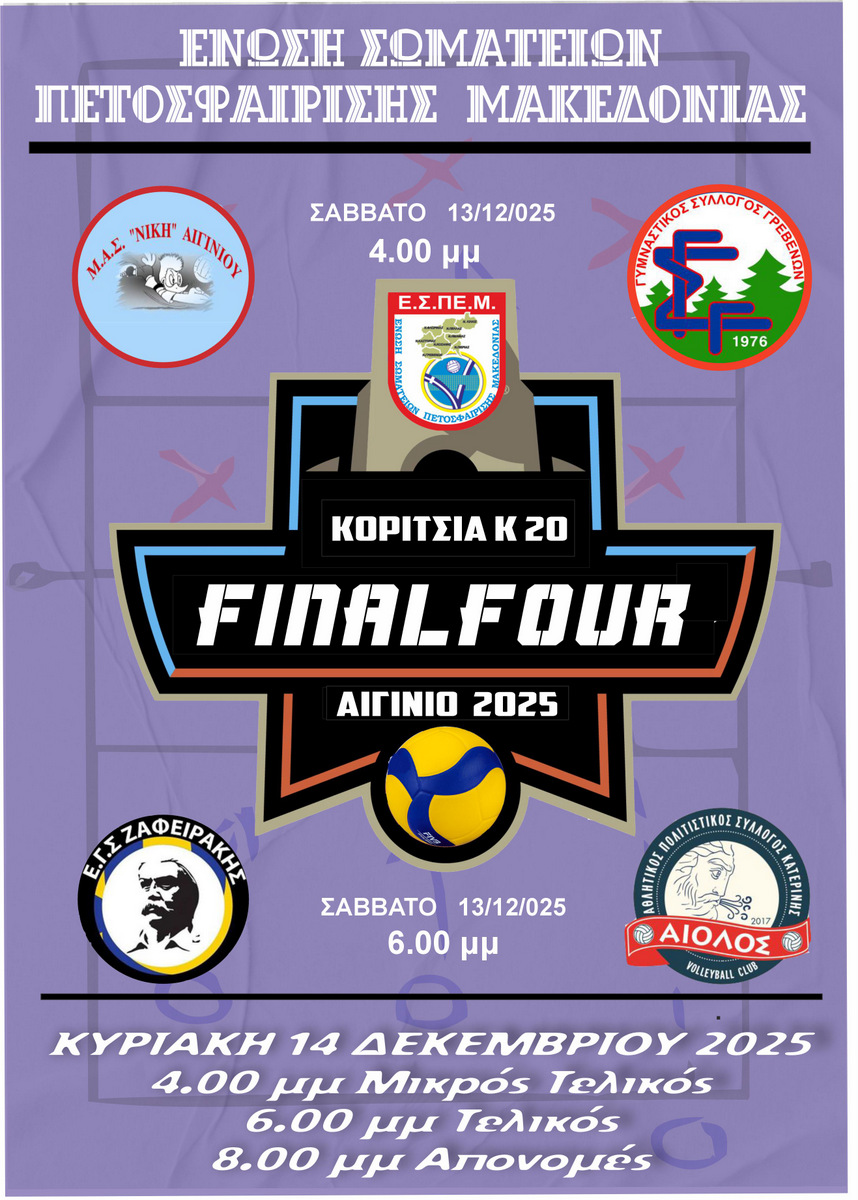 Το Σάββατο 13 και την Κυριακή 14 Δεκεμβρίου 2025 θα διεξαχθεί το Final Four του πρωταθλήματος Κοριτσιών Κ20 της Ε.Σ.ΠΕ.Μ. στο Κλειστό Γυμναστήριο Αιγινίου σύμφωνα με το παρακάτω πρόγραμμα.