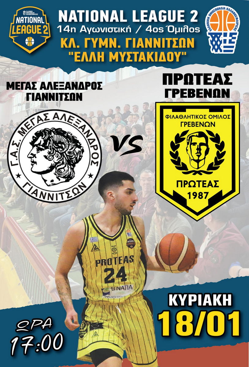 Τον Μέγα Αλέξανδρο Γιαννιτσών θα αντιμετωπίσει εκτός έδρας ο Πρωτέας Γρεβενών για την 14η αγωνιστική, στο Κλειστό Γυμναστήριο Γιαννιτσών ΄΄ΕΛΛΗ ΓΙΑΝΝΙΤΣΩΝ΄΄ την Κυριακή 18-1-2026 και ώρα 17:00 .