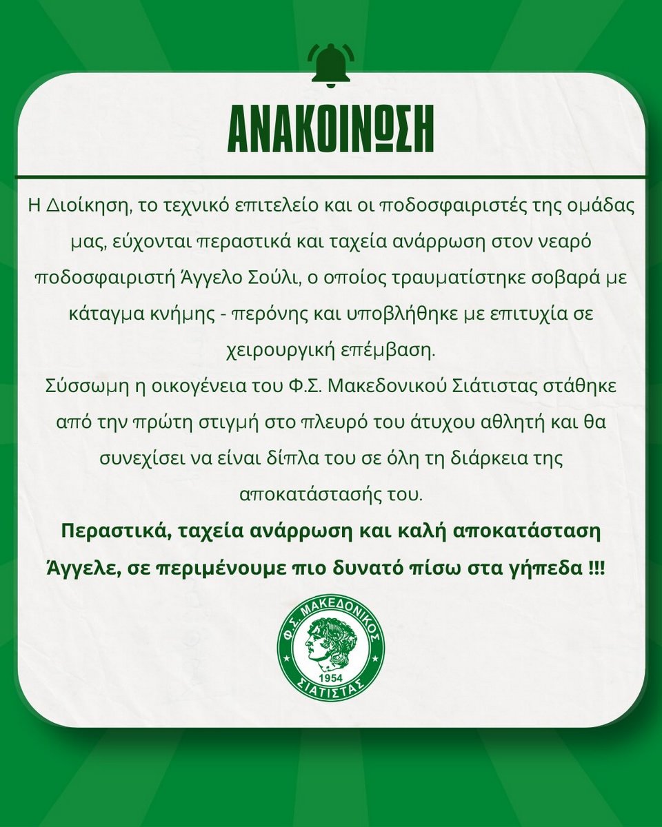 Μακεδονικός Σιάτιστας: "Περαστικά και ταχεία ανάρρωση στον Άγγελο Σούλι μετά τον σοβαρό τραυματισμό του".