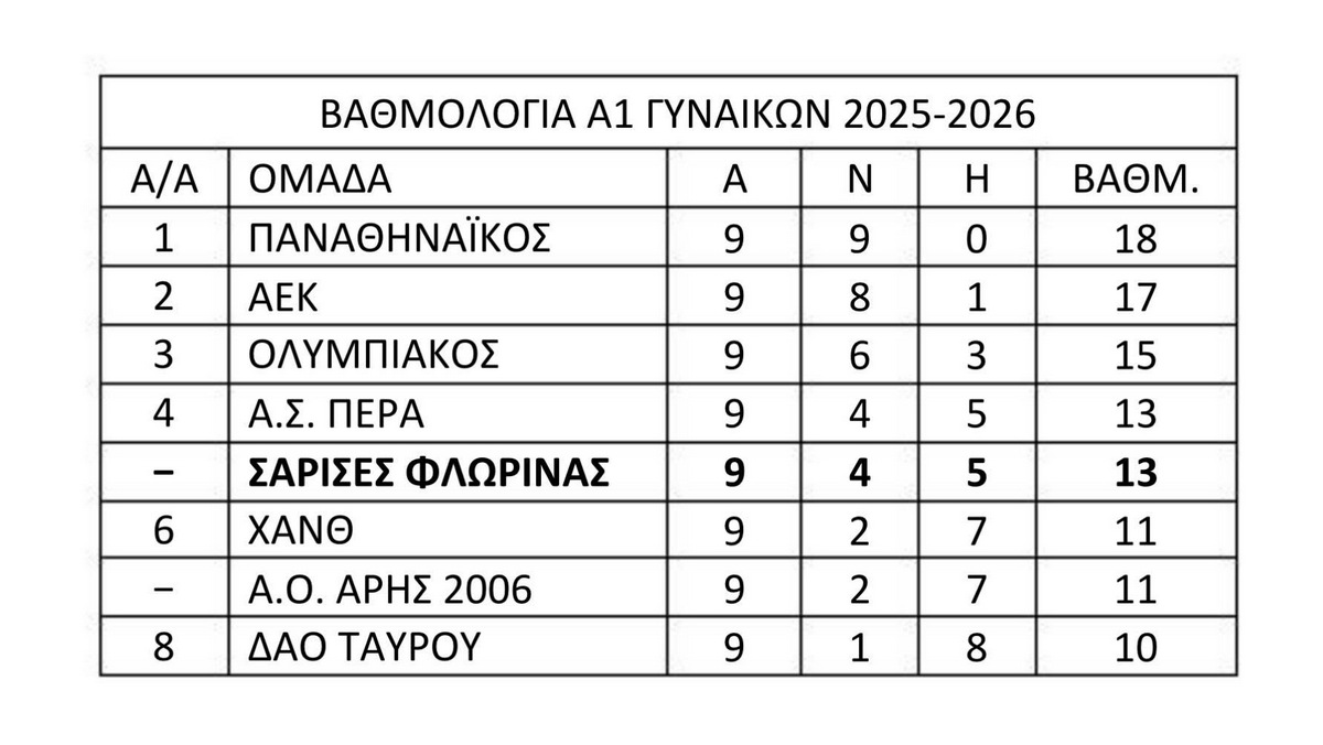 Το Σαββατοκύριακο 24-25/01/2026 συνεχίστηκε το Πρωτάθλημα της Α1 Γυναικών Επιτραπέζιας Αντισφαίρισης με την 7η, 8η και 9η αγωνιστική. Οι Σάρισες Φλώρινας αγωνίστηκαν στο ΣΕΦ στον Πειραιά και αντιμετώπισαν τις ομάδες του ΔΑΟ Ταύρου, του Άρη 2006 και της ΑΕΚ.