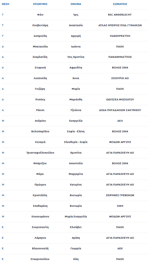 Αναλυτικά τα ονόματα των παικτριών που κλήθηκαν από την ομοσπονδιακή τεχνικό: