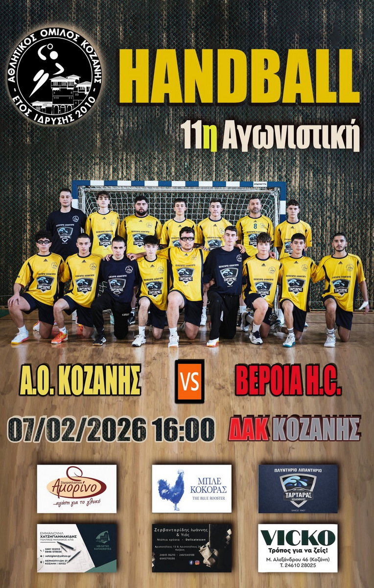 Το Σάββατο 07/02 στις 16:00, η ομάδα Handball του Α.Ο. Κοζάνης δίνει έναν αγώνα απέναντι στη Βέροια H.C., στο ΔΑΚ Κοζάνης.
