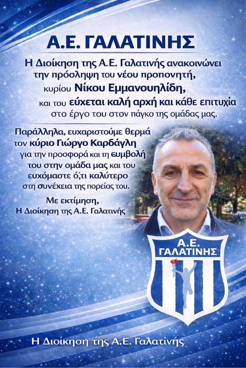 Νέο προπονητής της Α.Ε. Γαλατινής ο Νίκος Εμμανουηλίδης.