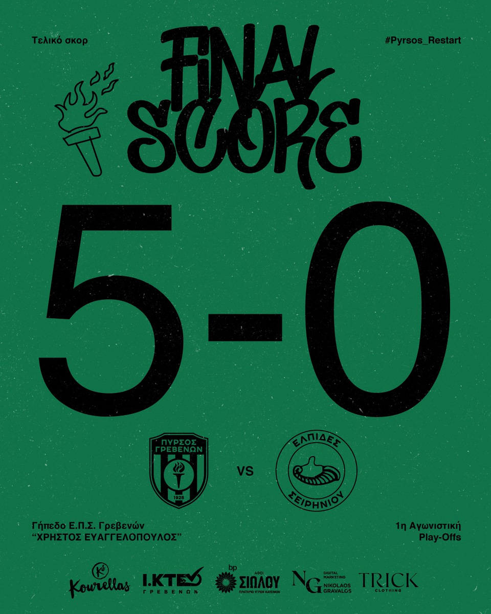 Νίκη με σκορ 5-0 για τον Πυρσό απέναντι στις Ελπίδες, στο πλαίσιο της 1ης αγωνιστικής των Play-Offs.