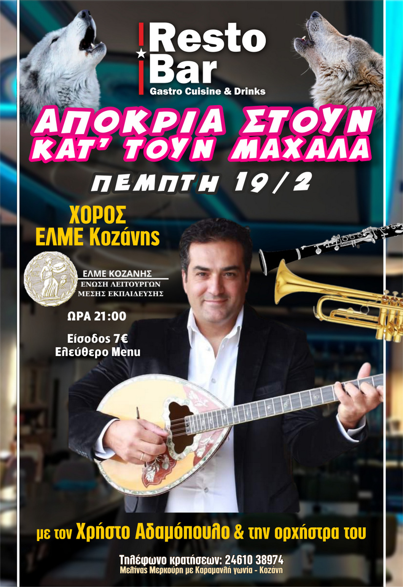 Resto Bar: Χορός ΕΛΜΕ Κοζάνης με τον Χρήστο Αδαμόπουλο και την ορχήστρα του σήμερα Πέμπτη 19 Φεβρουαρίου!