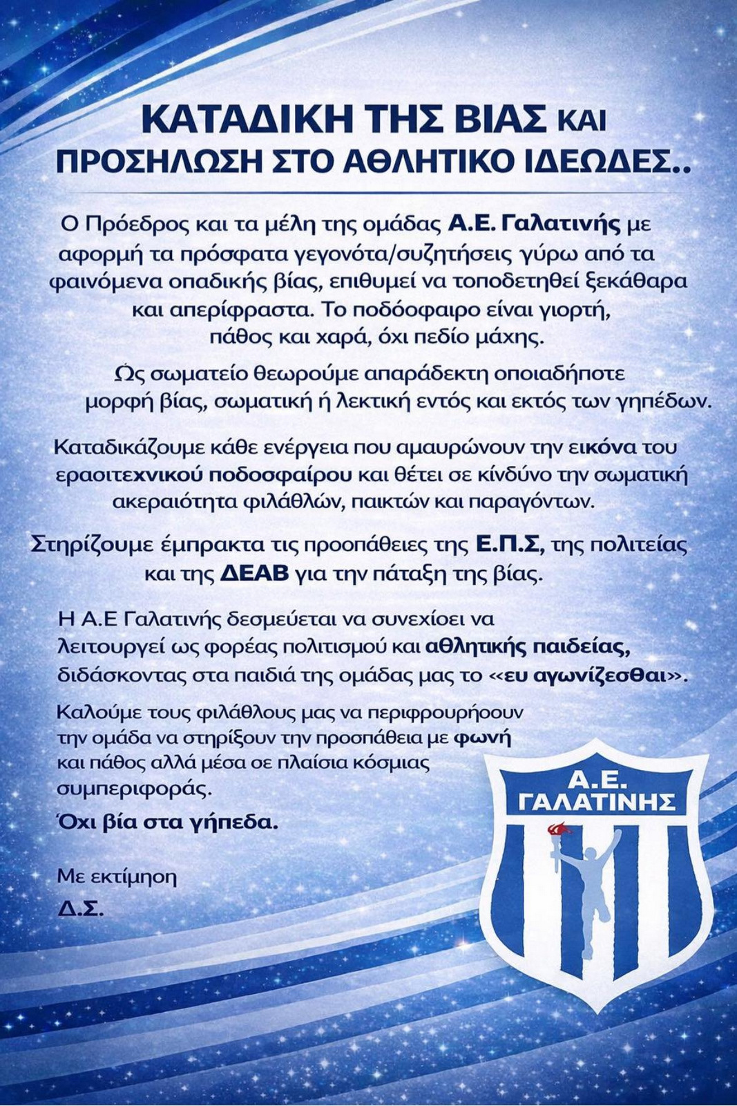 Ανακοίνωση της Α.Ε. Γαλατινής για τα επεισόδια: «Καταδικάζουμε τη βία - Το ποδόσφαιρο είναι γιορτή».