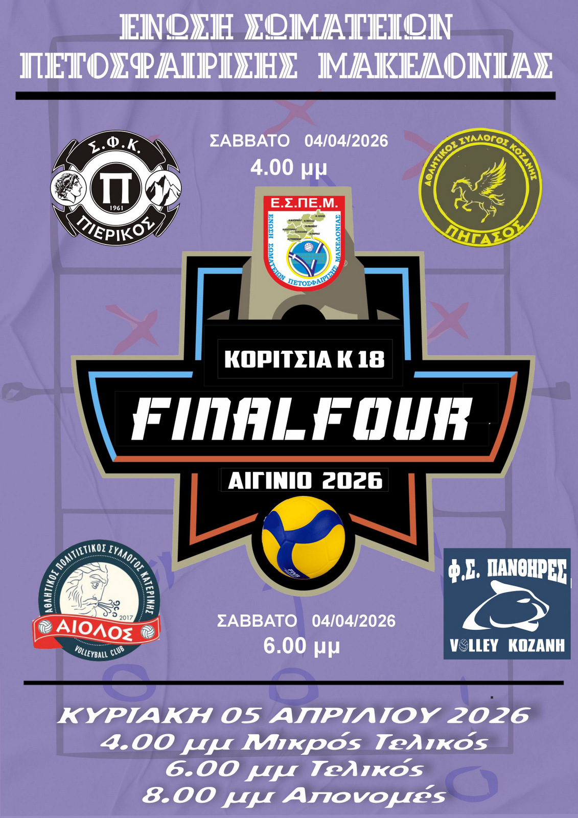 Το Σάββατο 04 και την Κυριακή 05 Απριλίου 2026 θα διεξαχθεί το Final Four του πρωταθλήματος Κοριτσιών Κ18 της Ε.Σ.ΠΕ.Μ. στο Κλειστό Γυμναστήριο Αιγινίου σύμφωνα με το παρακάτω πρόγραμμα.