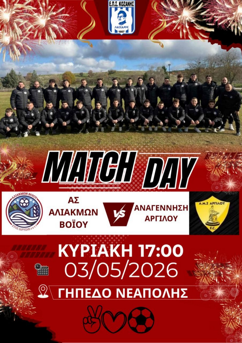 Την Κυριακή όλοι γήπεδο, η ομάδα μας με νίκη απέναντι στην Αναγέννηση Αργίλου στέφεται πρωταθλήτρια για το Πρωτάθλημα της Β' Ερασιτεχνικής κατηγορίας της ΕΠΣ ΚΟΖΑΝΗΣ!