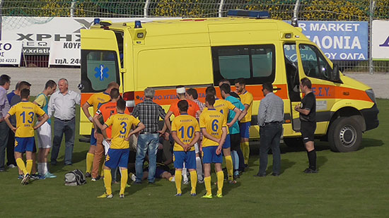 Στο 55’ έγινε η φάση που «στιγμάτισε» το παιχνίδι, καθώς σε μια εναέρια μονομαχία κοντά στο κέντρο του γηπέδου, ο Γιάννης Τάσιος έπεσε «αναίσθητος» στον αγωνιστικό χώρο «παγώνοντας» τους πάντες στο γήπεδο, με τους ποδοσφαιριστές να «πανικοβάλλονται» φοβούμενοι τα χειρότερα. Υπήρξε διακοπή 21’ λεπτών, μέχρι τη στιγμή που αποχώρησε με ασθενοφόρο (το οποίο ήρθε άμεσα μέσα σε 10-12 λεπτά) για το Μποδοσάκειο Νοσοκομείο Πτολεμαϊδας, όπου έμεινε προληπτικά για ανάρρωση. Σε αυτό το σημείο αξίζει να σημειώσουμε πως αποφεύχθηκαν τα «χειρότερα» χάρη στην άμεση και ουσιαστική επέμβαση του γιατρού του αγώνα Δημήτρη Καραδήμου, ο οποίος και χειροκροτήθηκε απ’ όλους.